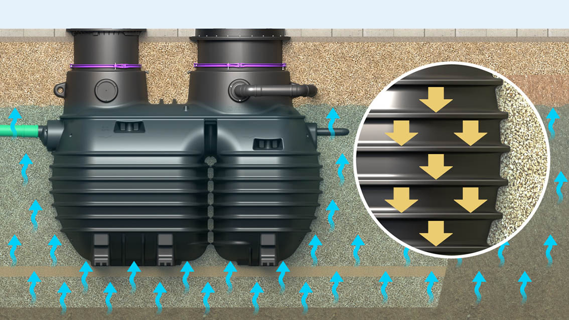Dankzij de hoge grondwaterbestendigheid is het reservoir van de EasyClean ground Multi zelfs bij hoge grondwaterstanden betrouwbaar. Bovendien blijft het reservoir dankzij de ribben uiterst stabiel in de grond. Ideaal voor langdurig en betrouwbaar gebruik onder uitdagende omstandigheden.