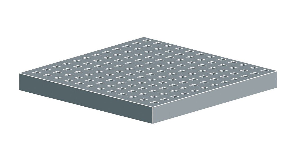 Geschikt voor blote voeten, oppervlakte geborsteld, slipweerstand R 12 (DIN 51130), evaluatiegroep C (DIN 51097), gatdiameter: 8 mm, inlegdiepte: 25 mm, dikte: 2 mm, klasse: K 3